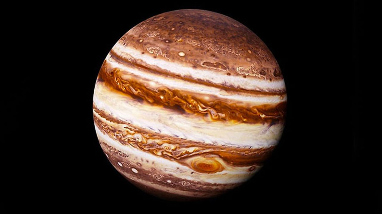 Jüpiter'in beyaz, sarı, kalın kırmızı ve kahverengi bulutları var gibi görünüyor. Bu bulutlar, gezegen kendi ekseni etrafında dönerken, gezegenin etrafında ters yönde yüksek hızlarda hareket ederler. Bu fırtınaların en büyüğü, bir kasırgayı andıran yüksek hızda ekvatorun etrafında hareket eden Büyük Kırmızı Lekedir.