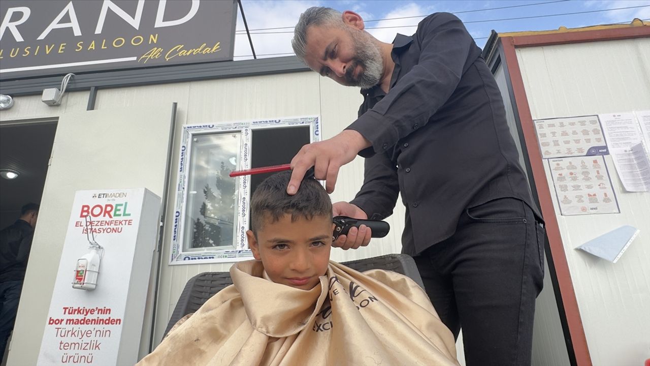 Dörtyol ilçesi Numune Evler Mahallesi'ndeki çadır kentte berber olmadığını fark eden Ali Çardak, yetkililerle görüşerek konteyner kurdu.