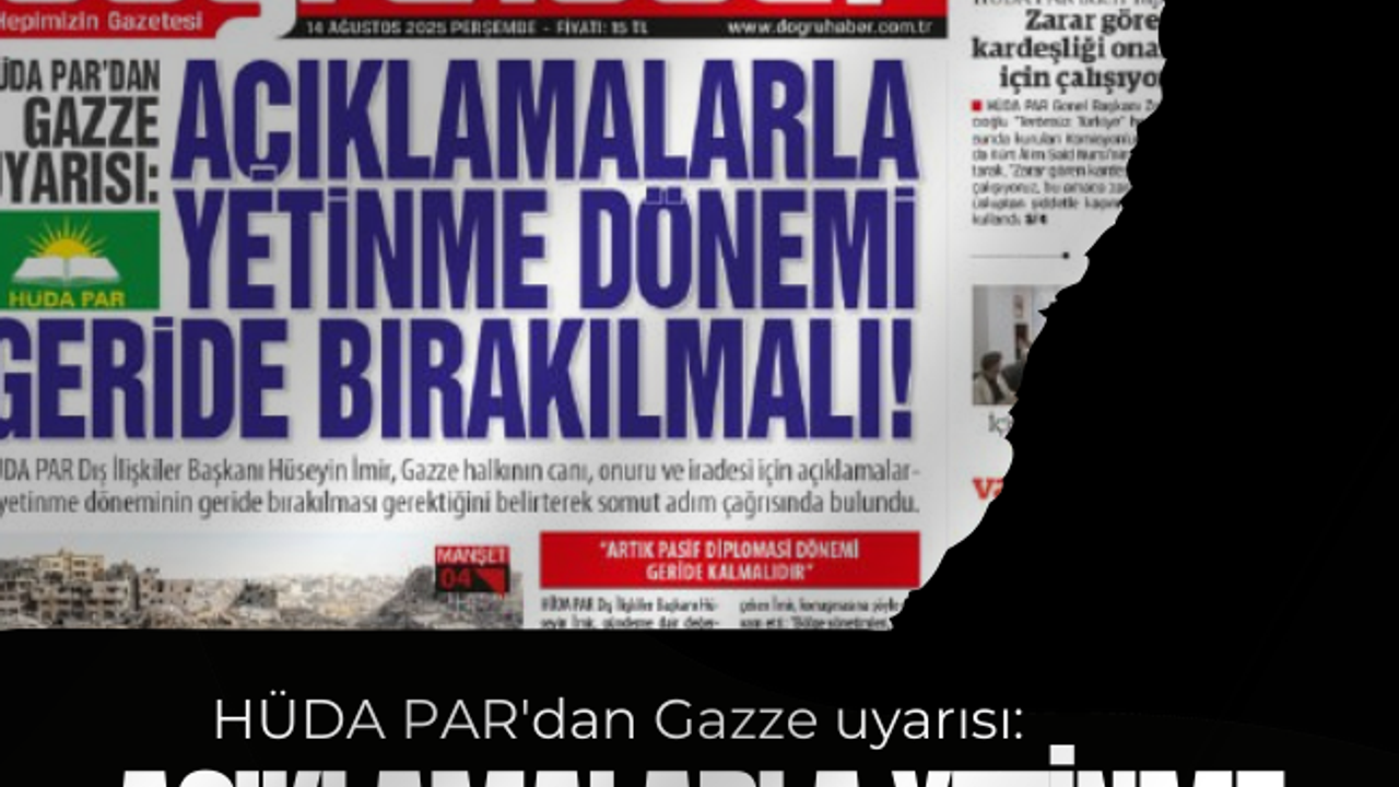 HÜDA PAR Dış İlişkiler Başkanı Hüseyin İmir, gündeme dair değerlendirmelerde bulunduğu açıklamasında Gazze’deki soykırıma dikkat çekerek işgalci rejime karşı topyekûn bir baskı kurulması çağrısında bulundu. Açıklamasına geçtiğimiz pazar günü Ankara Kocatepe Camii’nden Meclis’e düzenlenen yürüyüşe değinerek başlayan İmir, “Ankara Filistin Dayanışma Platformu (ANFİDAP) ve Anadolu Sivil Toplum Platformu (ASTP) tarafından 'Anadolu’dan Meclis’e Meclis’ten Gazze’ye İnsani Koridor' talebiyle bir yürüyüş düzenledi. Yürüyüşe Anadolu’nun dört bir yanından kanaat önderlerimiz, sivil toplum kuruluşlarımız ve halkımız katıldı. Yürüyüşü düzenleyen STK’lara ve katılan halkımıza şükranlarımızı sunuyoruz. Bu anlamlı yürüyüşün Meclis’te bulunan tüm siyasi partilerin Gazze özelinde 'insanlık ittifakı' kurup Gazze’ye insani koridorun açılması için gerekli sorumluluğu alıp harekete geçmesini ümit ediyoruz.” şeklinde konuştu.