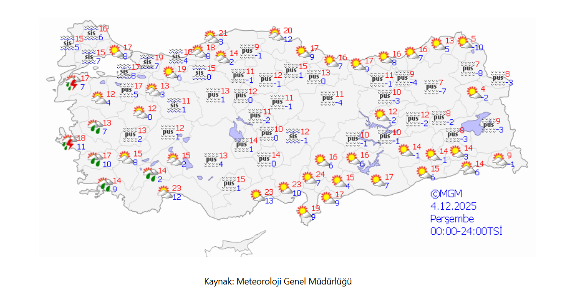 Meteoroloji Genel Müdürlüğü’nden yapılan tahminlere göre, 4 Aralık Perşembe günü aralarında Marmara Bölgesi, Akdeniz Bölgesi ve Ege Bölgesi'nin bulunduğu 6 bölge ilinde yağış bekleniyor.