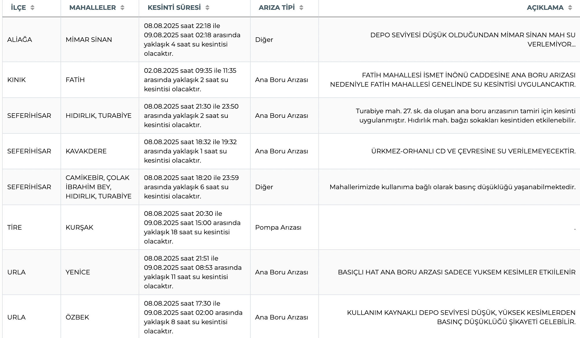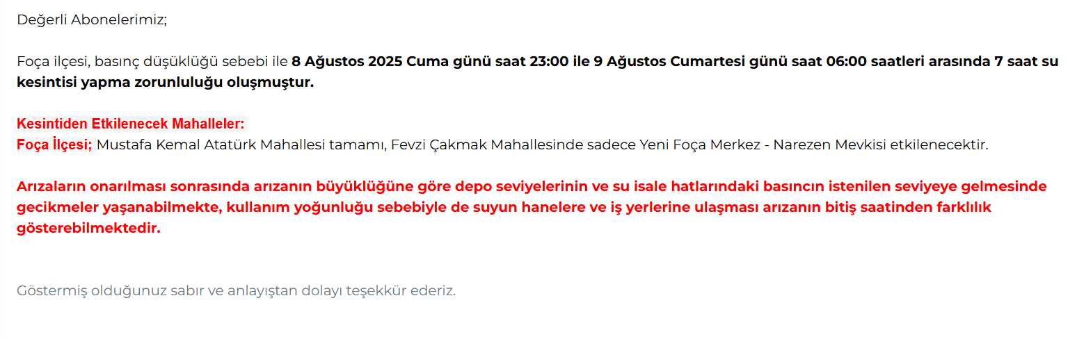 | SEFERİHİSAR | CAMİKEBİR, ÇOLAK İBRAHİM BEY, HIDIRLIK, TURABİYE | 08.08.2025 saat 18:20 ile 23:59 arasında yaklaşık 6 saat su kesintisi olacaktır. | Diğer | Mahallerimizde kullanıma bağlı olarak basınç düşüklüğü yaşanabilmektedir. |