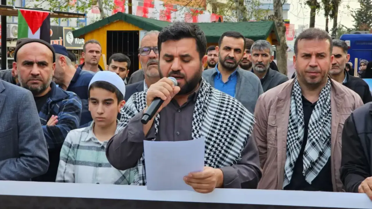 Cuma namazı çıkışı toplanan kalabalık, Gazze'ye destek sloganları attı. Basın açıklaması Eşref Hüseyin Aktan'ın Kur'an-ı Kerim tilavetiyle başladı.