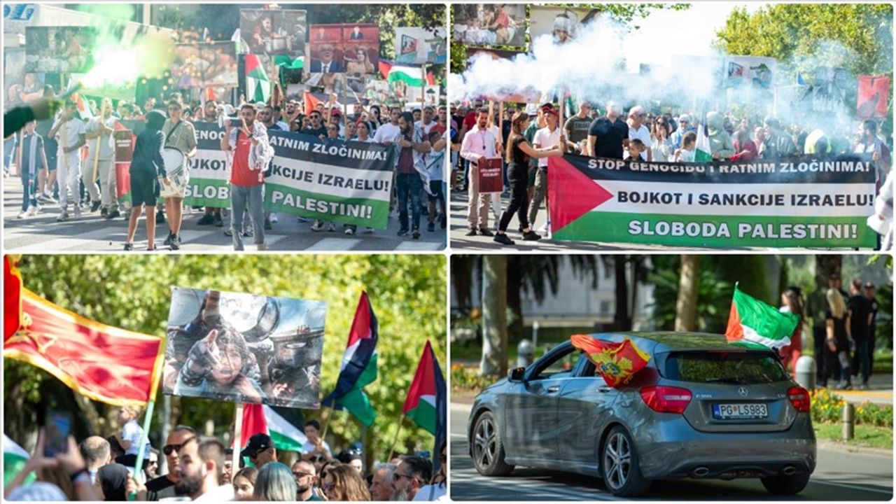 Podgoritsa'daki Karadağ Meclisi binası önünde toplanan kalabalık, "Özgür Karadağ, Özgür Filistin için" sloganıyla düzenlenen gösteride, işgal rejimin Filistin'de işlediği suçlara ilişkin karar tasarısının mecliste oylanması talebinde bulundu.