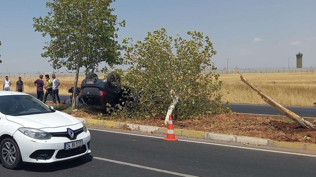Çarpmanın etkisiyle ağaç devrilirken otomobil refüjde ters yattı.