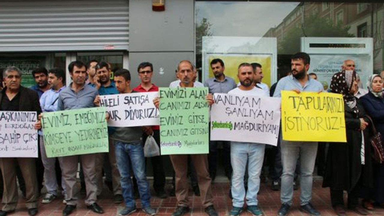 Ev sahiplerini mağdur ettiği ileri sürülen bankanın önüne toplanan site sakinleri, duruma tepki göstererek, satışların durdurulmasını talep etti.