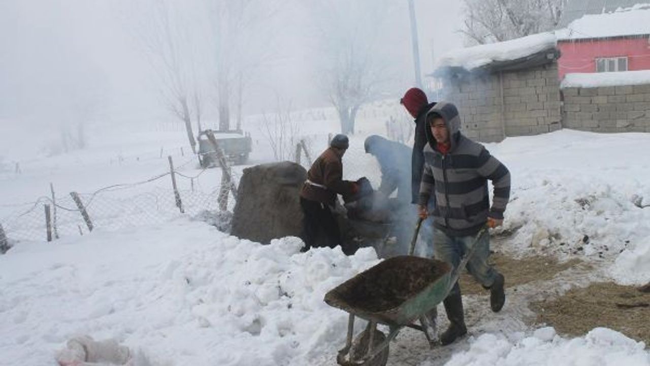 Havanın eksi 20 dereceyi bulduğu Muş Merkeze bağlı Konukbekler (Anzar) köyünde yaşayan Haşim Tarhan"ın ahırında biriken hayvan gübresini istiflemek için bir araya gelen köylüler, üşüdüklerinde dışarıda yaktıkları ateşle ısınmaya çalışıyorlar.