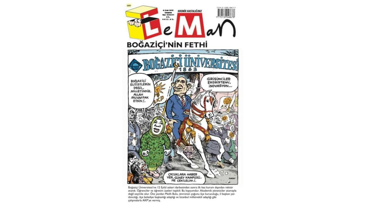Leman'ın kapağında yer alan karikatürde Cumhurbaşkanı Erdoğan'ın ataması işgal olarak nitelendirildi. Fatih Sultan Mehmet'in İstanbul'a girdiği beyaz ata bindirilen Bulu'nun etrafına ise Ak Parti flamaları ve Ak Partili kişiler ''Girişimciler Ekosistemi, inovasyon'' spotuyla yerleştirildi. 'Boğaziçi elitistlerin değil milletindir' yazan kapak çiziminde protestocuların ''Çocuklara haber ver güney kapısına çekilelim'' mesajı da kompozisyon dahilinde yer aldı.
