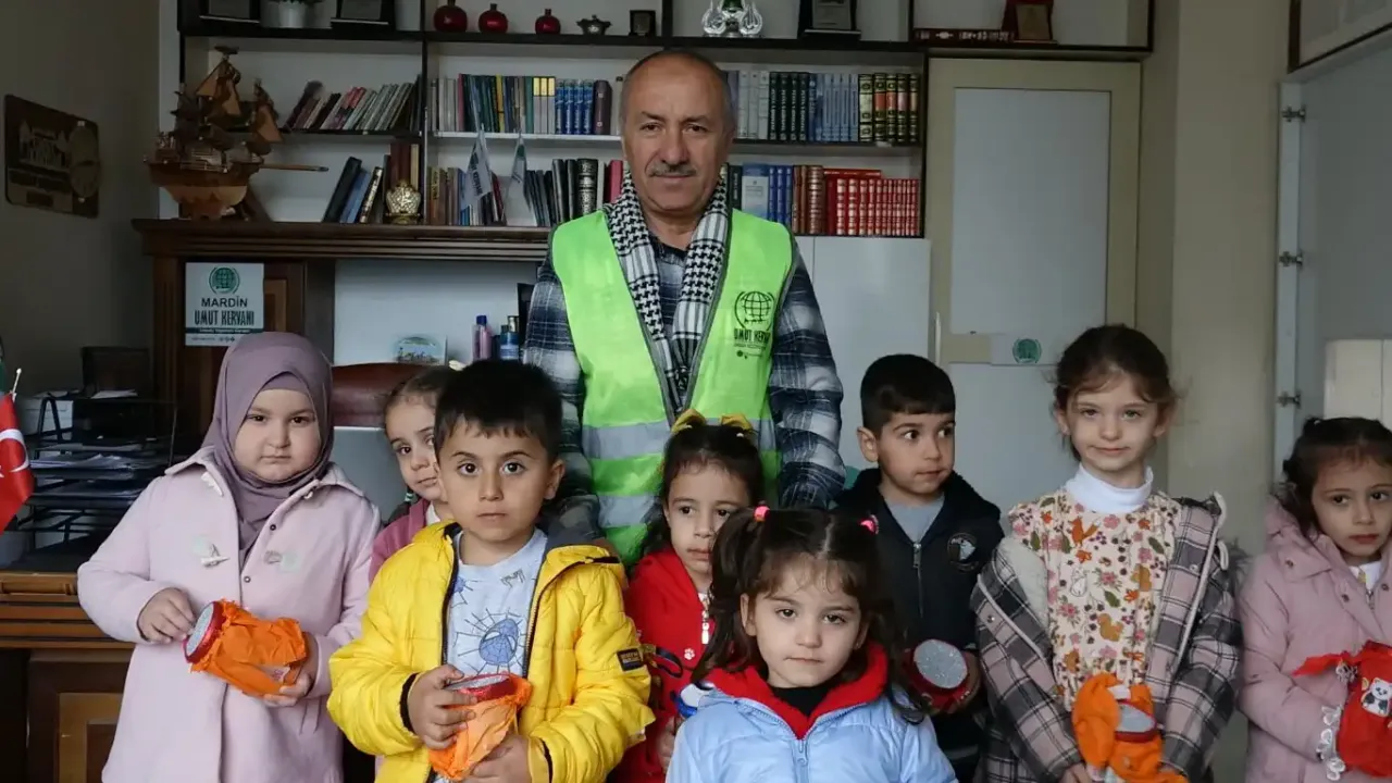 Yarım Elma Kreşi’ne giden minik çocuklar, Ramazan ayının başından bu yanan kumbarada biriktirdiği paraları Gazze’ye bağışlanmak üzere Mardin Umut Kervanı yetkililerine teslim etti.
