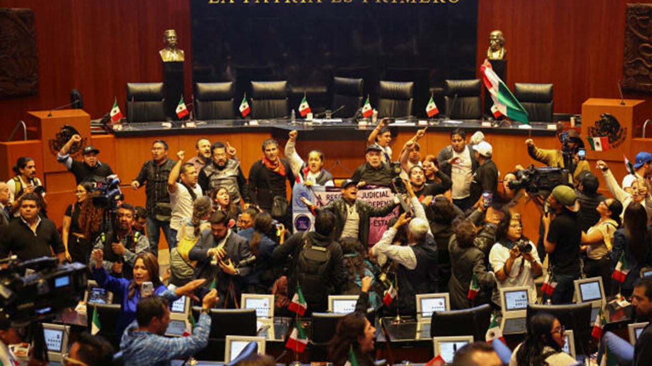 Güvenlik güçlerini aşarak Senato binasını basan yüzlerce protestocu, Meksika bayrakları ve yargı reformuna karşı pankartlar taşıdı.