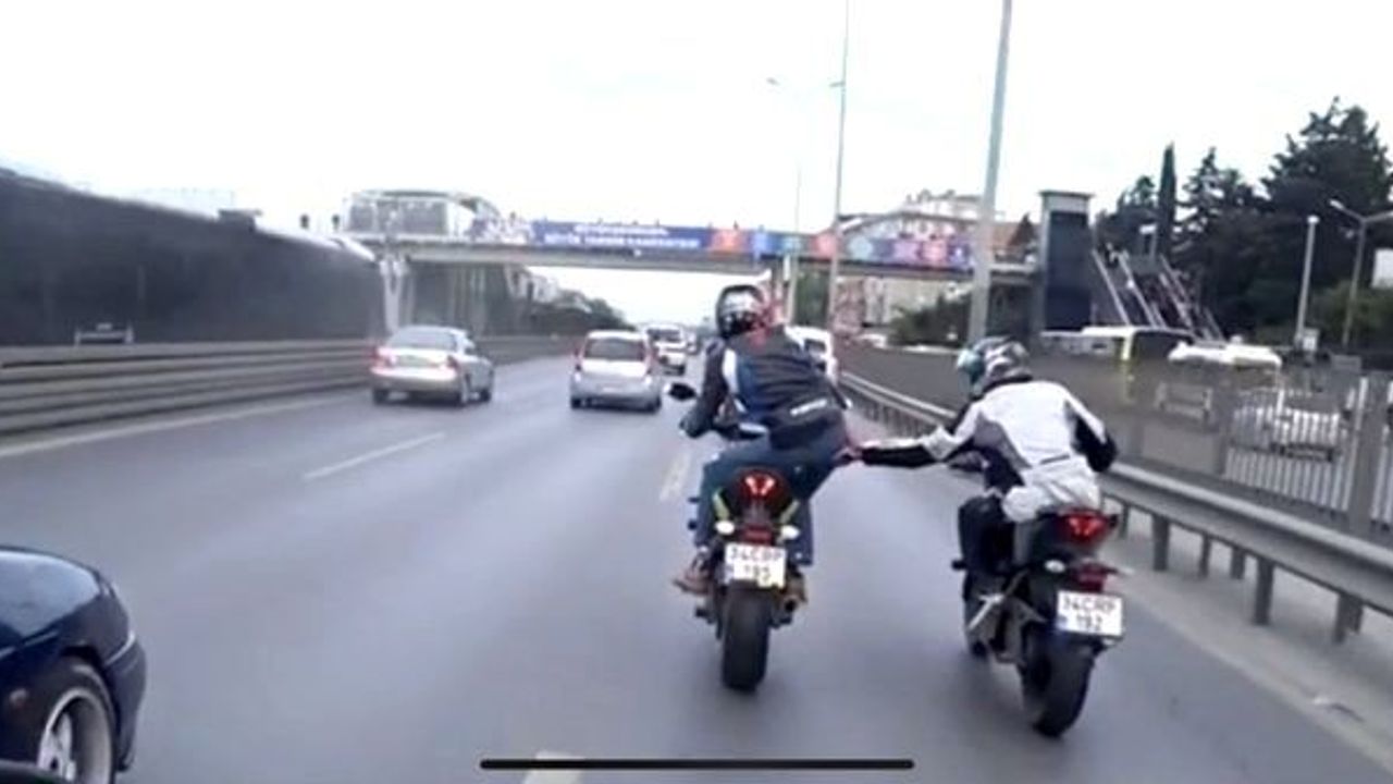 Çevresindeki sürücülerin canını bir an olsun düşünmeyen magandalardan biri, trafikteki sürücülerin arasında motosiklette ayağa kalkıp arkadaşına kalçasını dokundurttu. Sürücülerin gördükleri manzara karşısında şoke olduğu görüntüleri magandalar bir de sosyal medyada paylaştı.