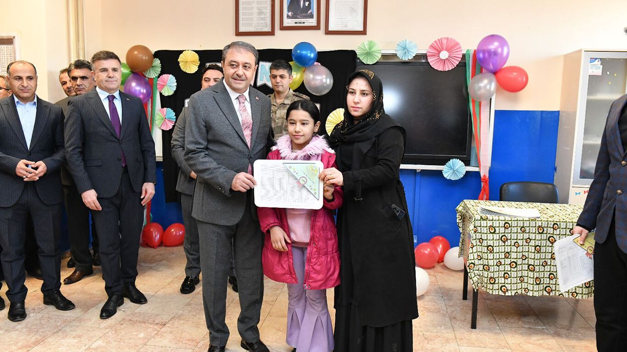 Haliliye ilçesi Konuklu İlkokulu"nda düzenlenen törende Şanlıurfa Valisi Hasan Şıldak ve Şanlıurfa İl Milli Eğitim Müdürü Asım Sultanoğlu, öğrencilere karnelerini dağıttı.