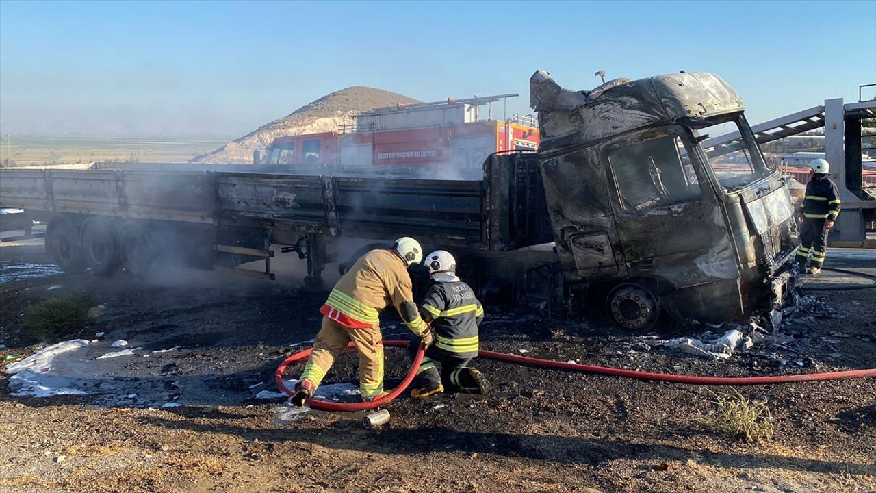 İtfaiye ekiplerince söndürülen yangın sonrası tır kullanılamaz hale geldi.