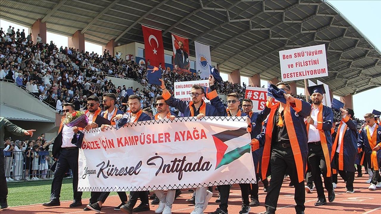 Sinop Üniversitesi Stadyumu'nda düzenlenen tören, öğrencilerin kortej geçişi ile başladı. Yürüyüşte bazı öğrenciler, İsrail'in Gazze'ye yönelik saldırılarını kınayan pankartlar taşıdı.