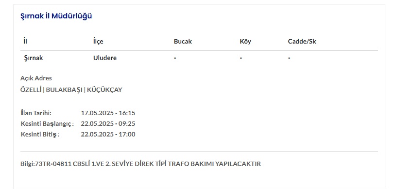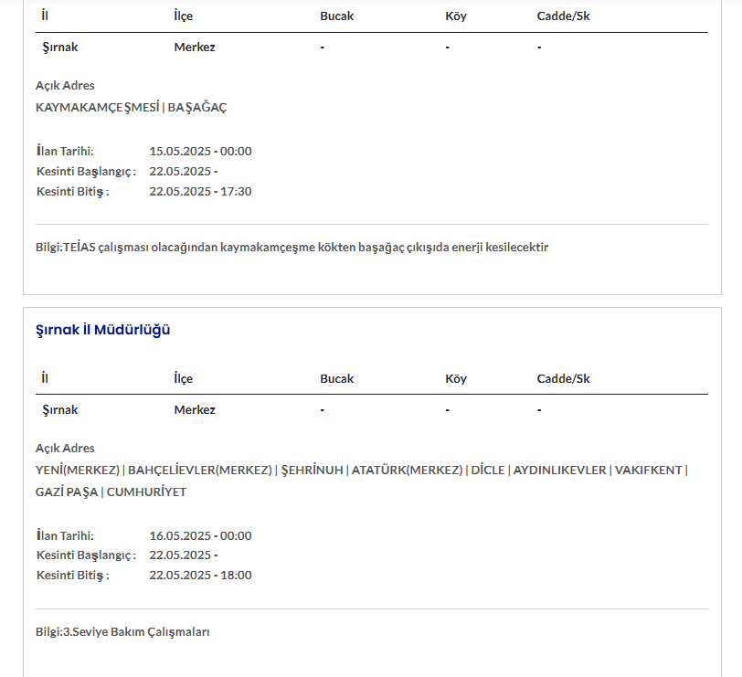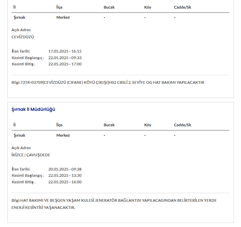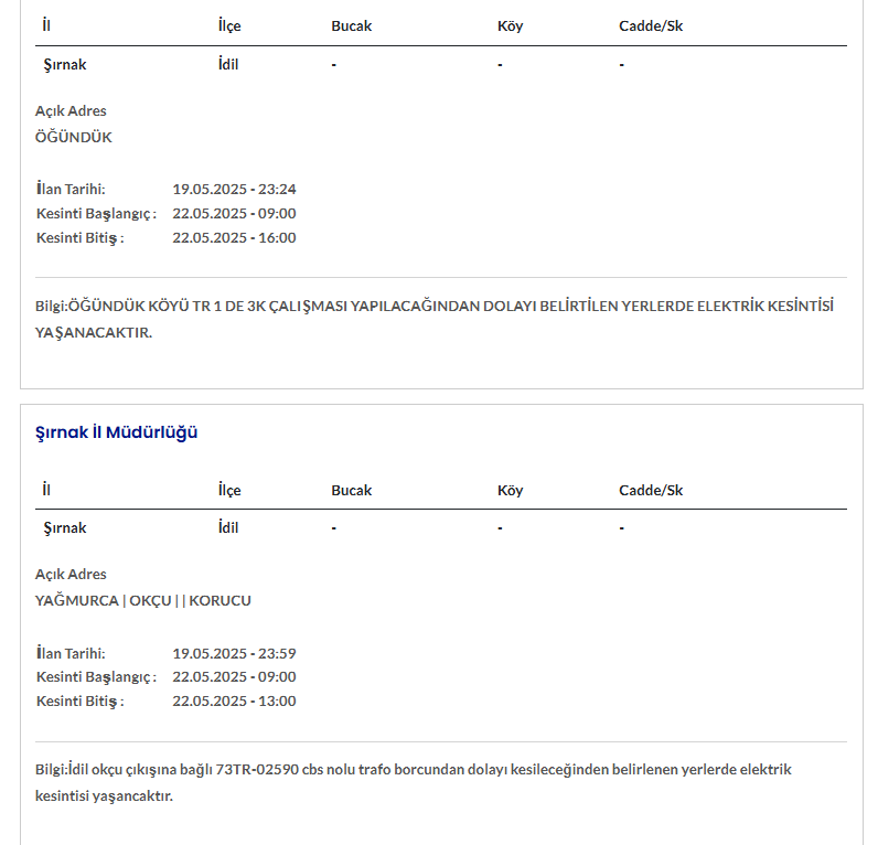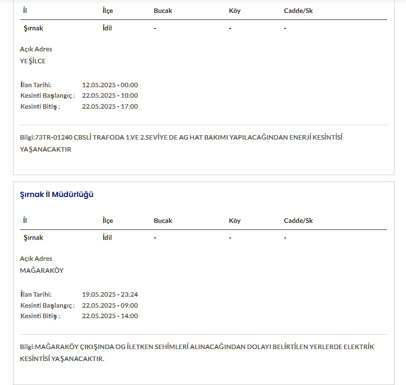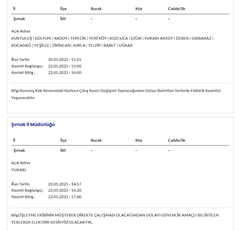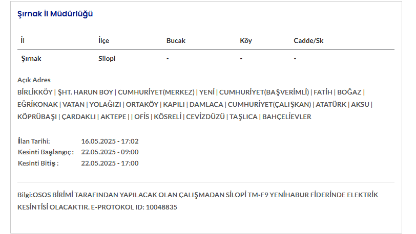 ŞIRNAK 22 MAYIS ELEKTRİK KESİNTİSİ AYRINTILARI