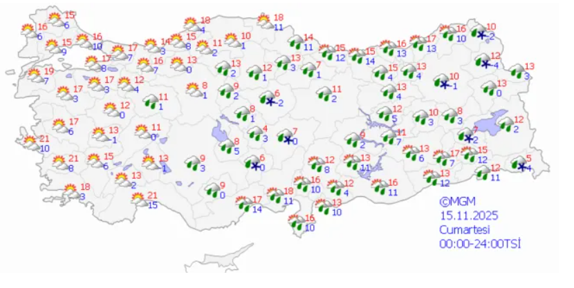 Meteoroloji Genel Müdürlüğü (MGM)'den yapılan uyarıda "Ülkemiz genelinin parçalı, yer yer çok bulutlu, Marmara'nın güney ve doğusu, İç Ege, Akdeniz, Batı ve Orta Karadeniz, Doğu ve Güneydoğu Anadolu'nun batısı ile Eskişehir, Ankara, Çankırı, Sivas ve Giresun çevrelerinin sağanak ve gök gürültülü sağanak yağışlı geçeceği tahmin ediliyor. Yağışların, Marmara'nın doğusu, Batı Karadeniz kıyıları ve İskenderun körfezi'nde yer yer kuvvetli olması bekleniyor." ifadelerine yer verildi.