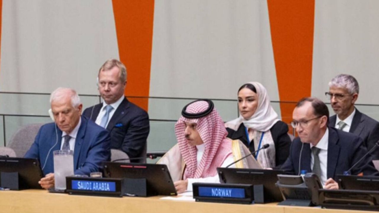 Prens Faysal bin Ferhan, Arap Birliği, İslam İşbirliği Teşkilatı (İİT) ve Norveç'in de katıldığı toplantıda yaptığı konuşmada, "İki Devletli Çözümün Uygulanması İçin Küresel İttifak"ın tanıtımını yaptı.