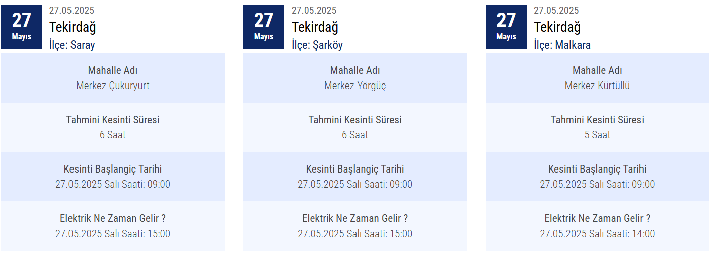 TEKİRDAĞ YARIN 27 MAYIS ELEKTRİK KESİNTİSİ YAŞANACAK İLÇE VE MAHALLELER