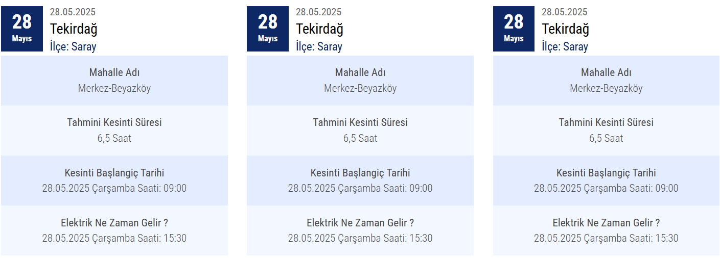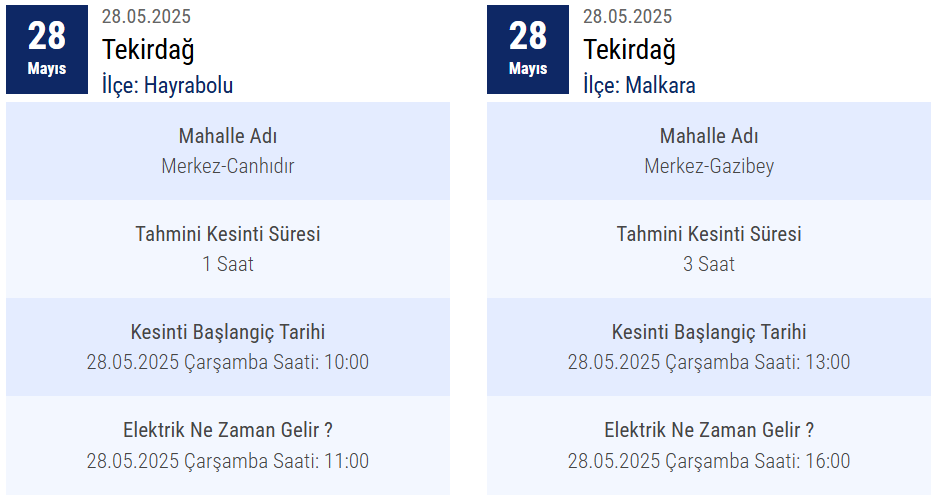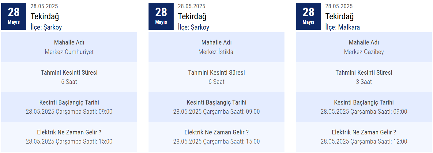 Bu kesintiler, Trakya Elektrik Dağıtım A.Ş. (TREDAŞ) tarafından planlanan bakım ve onarım çalışmaları kapsamında gerçekleştiriliyor. İleerleyen günlerin planlı kesintiler hakkında bilgi almak için TREDAŞ Elektrik Kesintisi Sorgulama sayfasını ziyaret edebilirsiniz.
