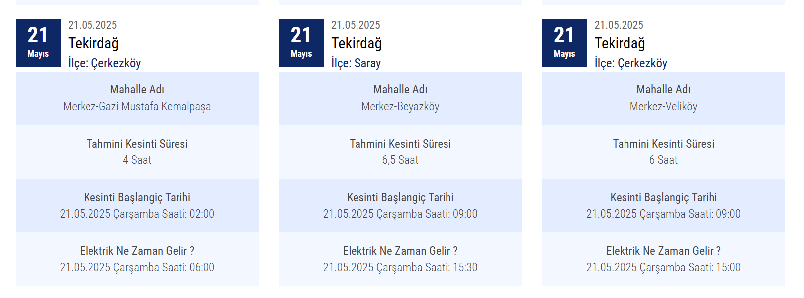 Tekirdağ'da 21 Mayıs 2025 Çarşamba günü çeşitli ilçelerde planlı elektrik kesintileri yaşanacak. Trakya Elektrik Dağıtım A.Ş. (TREDAŞ) tarafından yapılan açıklamaya göre, bakım ve altyapı çalışmaları kapsamında bazı mahallelerde saatler süren kesintiler uygulanacak. Elektrik kesintisinin yaşanacağı bölgeler ve saat bilgileri haberimizde...