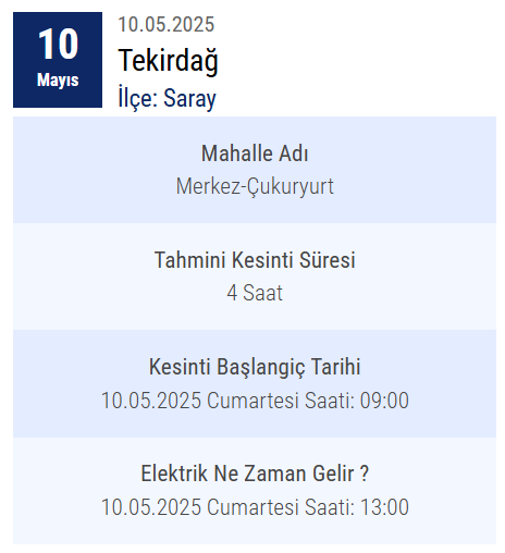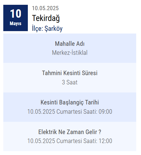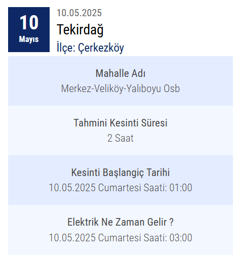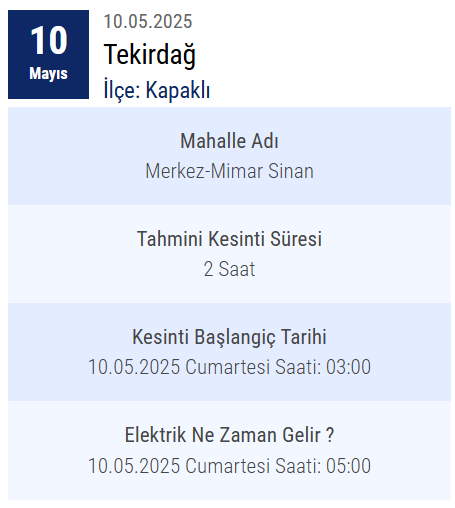 Tekirdağ'ın elektrik dağıtım hizmetlerini yürüten Trakya Elektrik Dağıtım A.Ş., 10 Mayıs 2024 Cuma günü planlı bakım ve altyapı iyileştirme çalışmaları nedeniyle elektrik kesintisi uygulanacağını resmen açıkladı.
