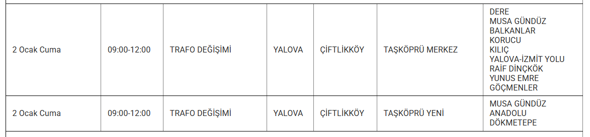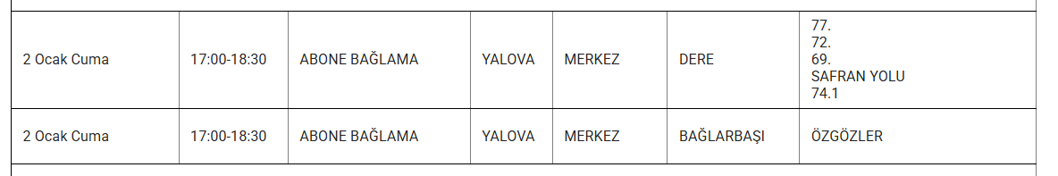 Ayrıca eskiyen elektrik hatları veya trafo arızaları da kesintilere yol açabiliyor. Uludağ elektrik gibi kuruluşlarda bu sorunları en aza indirmek için altyapı yenileme çalışmalarını sürdürdüğünü duyurdu. Işte 1 Ocak günü Yalova'da planlı bakım ve onarım çalışmaları kapsamında elektrik kesintisi yaşanacak ilçe ve mahalleler..