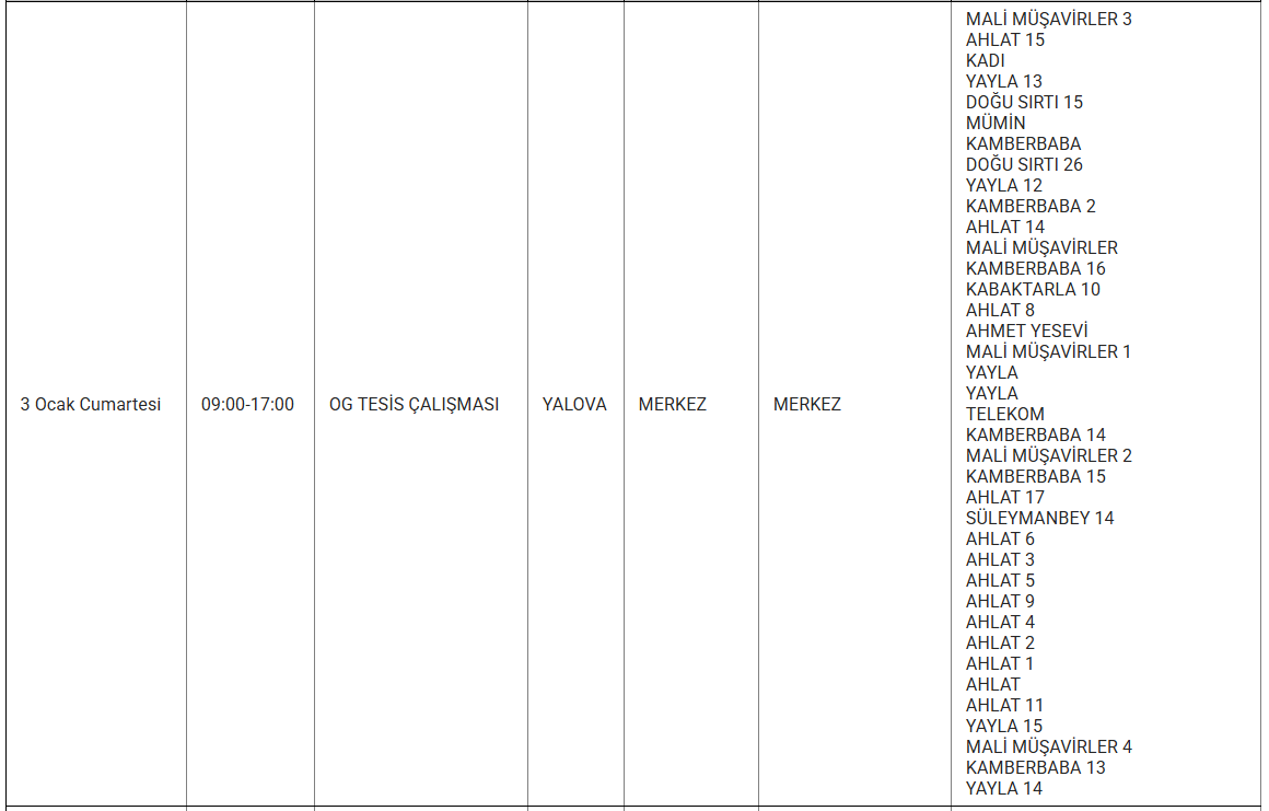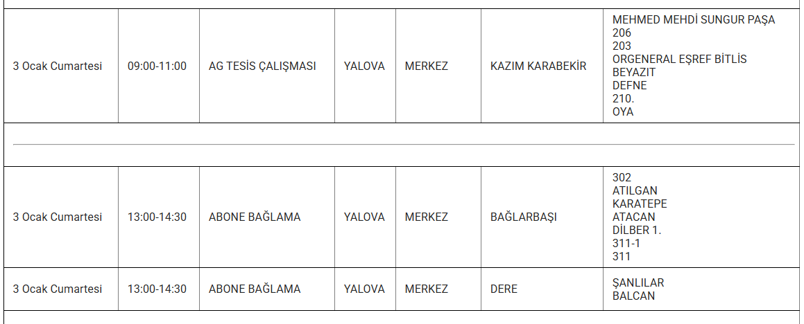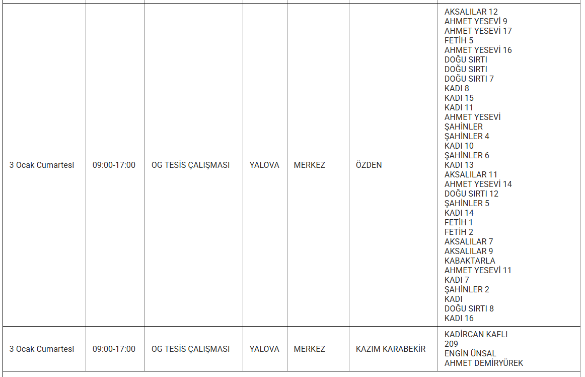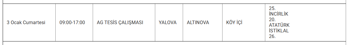 Ayrıca eskiyen elektrik hatları veya trafo arızaları da kesintilere yol açabiliyor. Uludağ elektrik gibi kuruluşlarda bu sorunları en aza indirmek için altyapı yenileme çalışmalarını sürdürdüğünü duyurdu. Işte 3 Ocak günü Yalova'da planlı bakım ve onarım çalışmaları kapsamında elektrik kesintisi yaşanacak ilçe ve mahalleler..