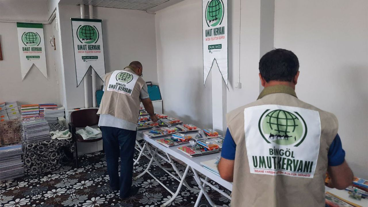Umut Kervanı Bingöl Derneği, okulların açılmasına sayılı günler kala, okul çantası başta olmak üzere beslenme çantası, kalem, silgi, açacak, defter çeşitleri ve etkinlik malzemelerinin bulunduğu paketleri hazırlayarak ihtiyaç sahibi öğrencilere teslim etti.