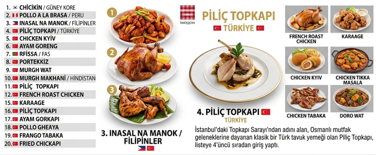İstanbul'daki Topkapı Sarayı'ndan adını alan, Osmanlı mutfak geleneklerine dayanan klasik bir Türkiye tavuk yemeği olan Piliç Topkapı, listeye 4'üncü sıradan giriş yaptı.