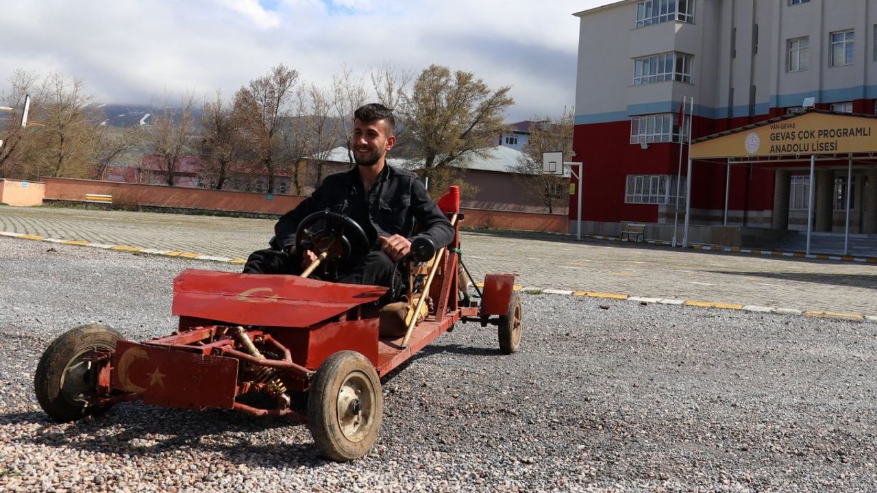 Gevaş Çok Programlı Anadolu Lisesi Tesisat Teknolojisi ve İklimlendirme Bölümü'nde okuyan 12"nci sınıf öğrencisi Zeynel Abidin Arvas, hurdadan elde ettiği parçaları arazi arabasına dönüştürdü.