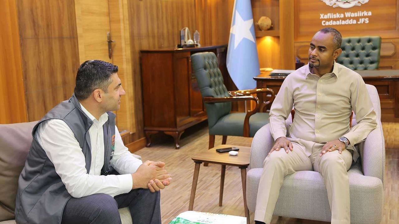 Hayır çalışmalarını yürütmek için Somali'de bulunan Avrupa Yetim Eli Derneği heyeti, Türkiye'de eğitim gördükten sonra Somali'de Adalet Bakanı olan Abdulkadir Mohammed Nur'u makamında ziyaret etti.