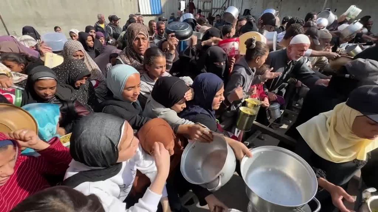 Sıcak yemek dağıtımı yapılan bir takiyyeye gelen Filistinli kadın Um Davud Ebu Kerş, zor şartlar altında ailesi için saatlerce sırada bekleyerek az miktarda yemeğe ulaşabiliyor.