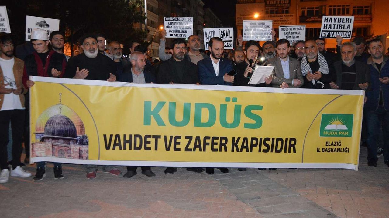 HÜDA PAR Elazığ İl Başkanlığı tarafından Elazığ Öğretmenevi önünde düzenlenen “Elazığ Kudüs’e Sahip Çık” konulu kitlesel basın açıklamasında, siyonist terör şebekesinin Ramazan ayında düzenlediği Mescidi Aksa baskınları telin edildi.
