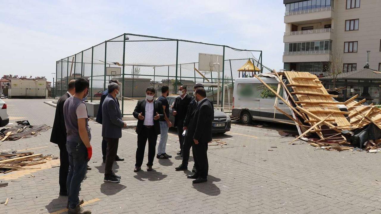 HÜDA PAR Gaziantep İl Başkanı Faruk Göçer beraberindeki partili heyetle birlikte dün etkili olan fırtına nedeniyle binalardaki çatıların uçması sonucu büyük çapta hasarın meydana geldiği siteyi ziyaret etti.