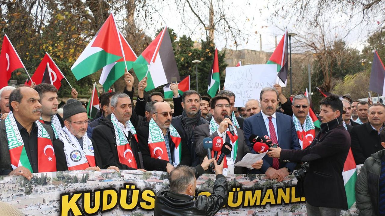 Cuma namazının ardından bir araya gelen Şanlıurfalılar, ABD’nin "Yüzyılın Anlaşması" dediği Filistinlileri yok sayan, Kudüs’ü siyonist işgalcilerin başkenti olarak ilan eden plana tepki gösterdi.