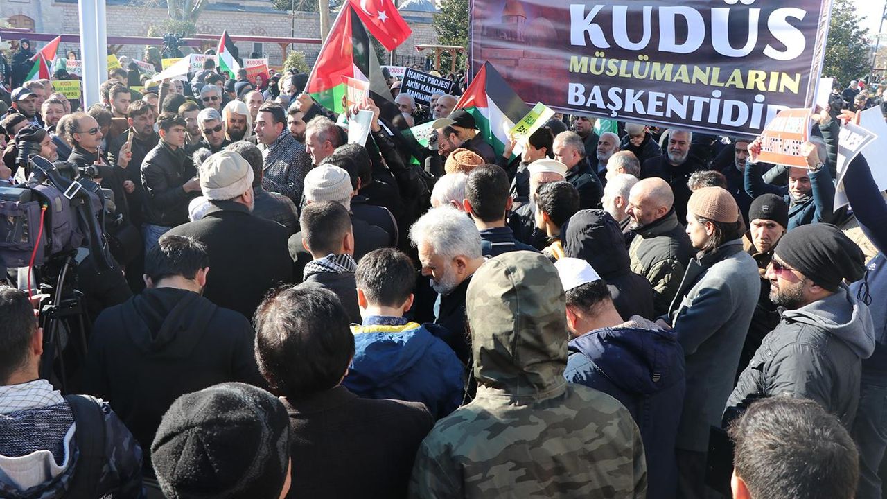 HÜDA PAR İstanbul İl Başkanlığı, işgalci ABD’nin şer planını tel'in etmek için organize ettiği protesto gösterisinde, siyasi parti ve STK’lar tek yürek olup Kudüs için haykırdılar.