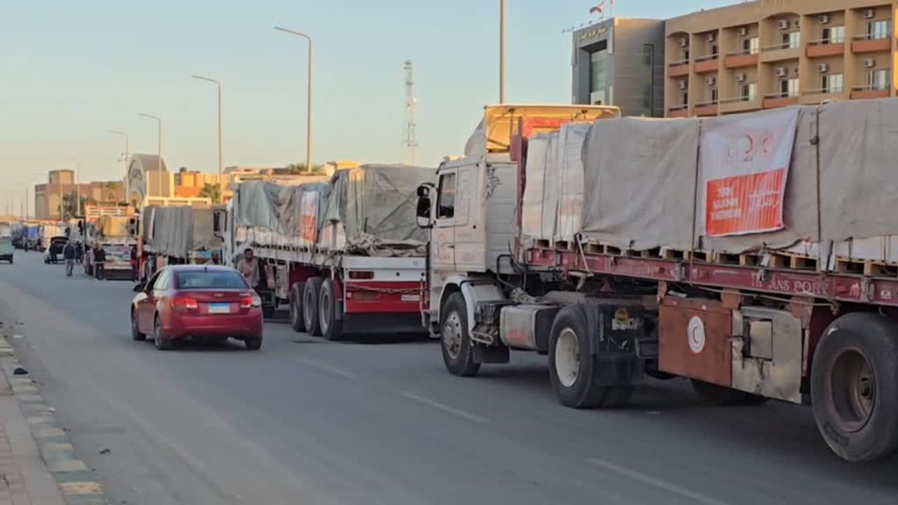 Afet ve Acil Durum Yönetimi Başkanlığı (AFAD) ve Kızılay işbirliğiyle Gazze’ye gönderilen temel gıda ve yardım malzemeleri taşıyan tırlar, Mısır’ın El-Ariş Limanı'ndan, Mısır ile Gazze arasındaki Refah sınır kapısına doğru hareket etti.