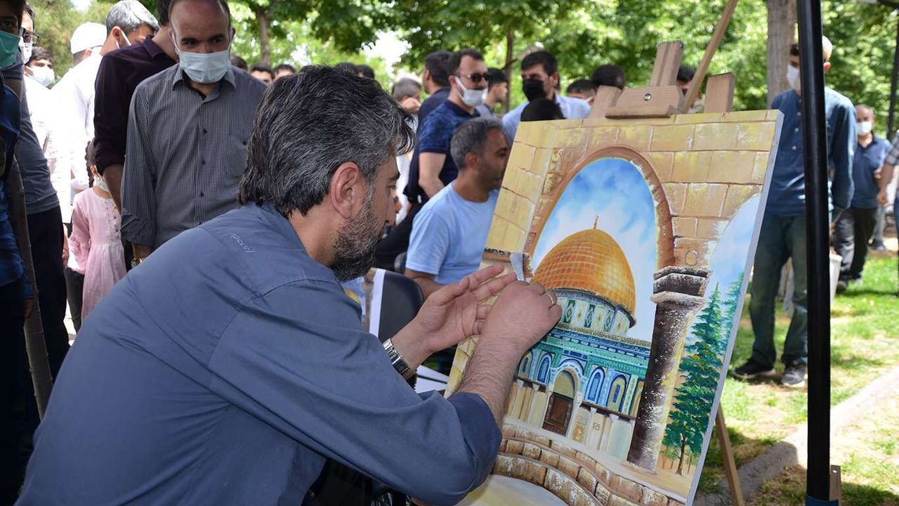 Siyonist işgalci rejimin katliamlarını ve Filistinli Müslümanların izzetli direnişini anlatan "Kudüs'ün Rengi" temalı resim sergisinin 3'üncü gününde Hamas'ın zaferinin gelmesiyle birlikte yoğun ziyaretçi akını oluştu.