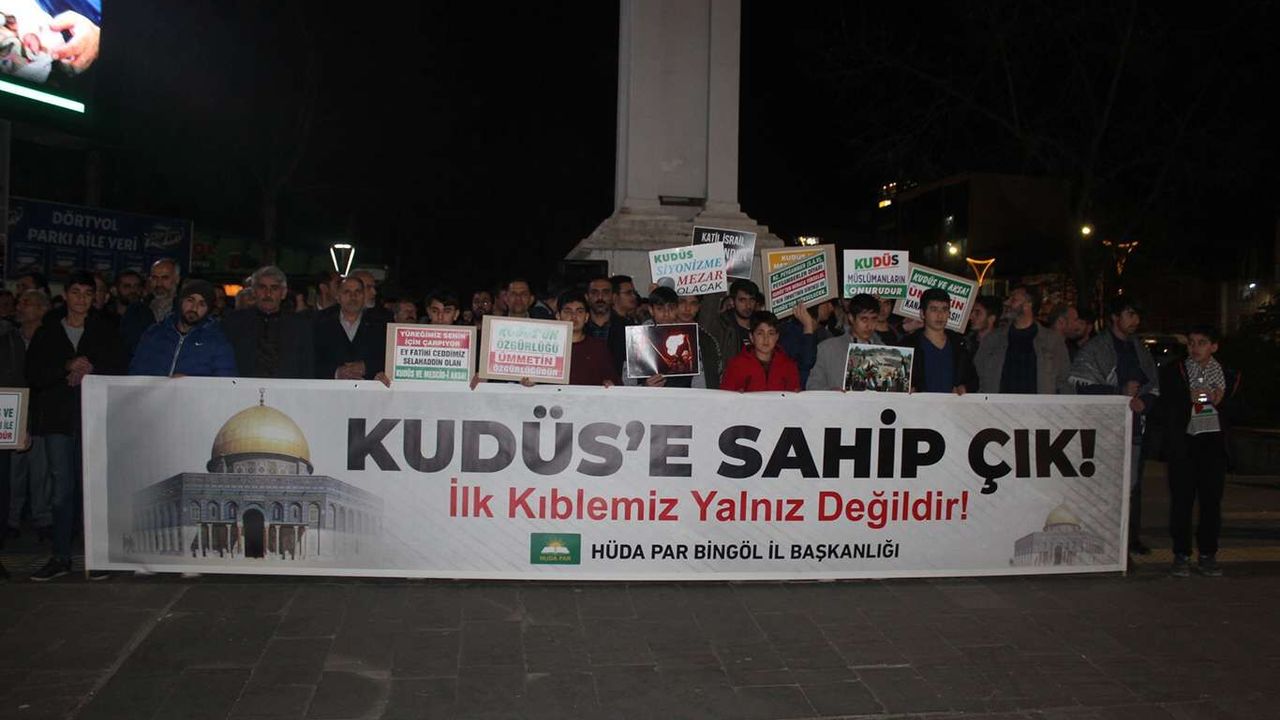 HÜDA PAR Bingöl il başkanlığı, teravih namazı sonrası Bingöl Merkez dört yol saat kulesi önünde siyonistlerin Mescid-i Aksa’ya saldırılarını kınamak için basın açıklaması yaptı.
