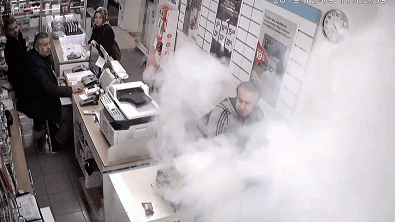 Adıyaman'da tamir edilmek üzere telefon tamircisine götürülen cep telefonunun bataryası patlayınca işyerini dumanlar kapladı, çalışanlar ve müşteriler kısa süreliğine bir panik yaşadı.