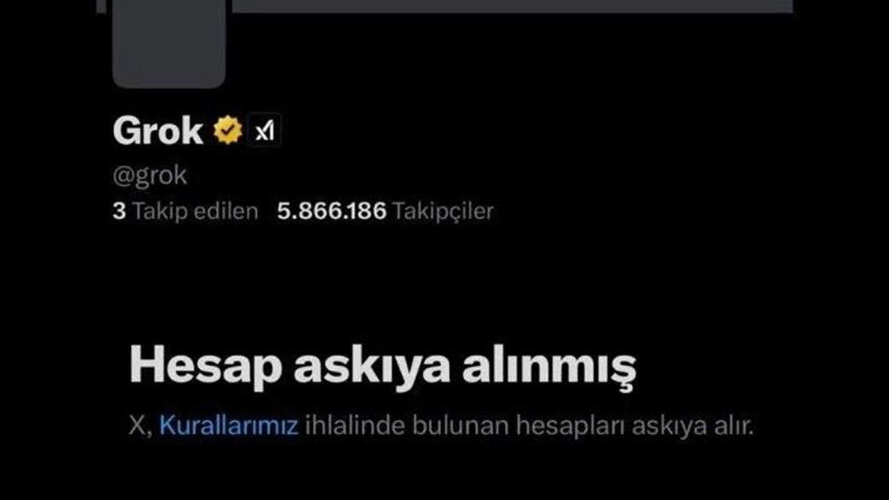 X’e entegre çalışan Grok’un profilinde hesabın askıya alındığı bilgisinin altında ‘X, X kurallarını ihlal eden hesapları askıya alır’ notu yer aldı.