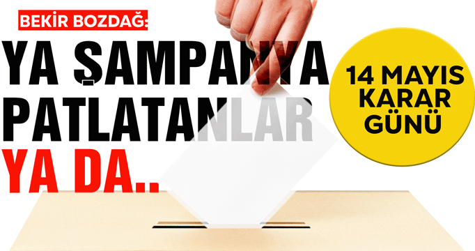 Seçimlerde ülkenin geleceğine karar verileceğini söyleyen Bozdağ, "14 Mayıs'ın akşamı Türkiye'de iki fotoğraftan biriyle karşılaşılır. Ya şampanya patlatıp bunu sabaha kadar kutlayanlar olacak ya da temiz alnını şükür için secdeye koyup Rabb'ine hamdedenler olacak. Bu ikisinden birini oluşturmak bizim, aziz milletimizin elindedir. O gece kimi sevindireceğimize iyi karar verelim. Ya Kandil sevinecek ya Şanlıurfa'nın asil insanları sevinecek. Ya FETÖ sevinecek ya bu milletin temiz evlatları sevinecek. Ya ABD'nin başkanı orada keyif yapacak ya da Türk milletinin her bir hanesi 'Cevabı ABD'ye verdik, AB'ye verdik, Türkiye'nin seçimi Londra'da, Washington'da değil Şanlıurfa'da yapılır, iktidarı da başka ülkeler değil, Şanlıurfa'nın asil insanları tayin eder' diye onlara büyük bir Osmanlı tokadını yapıştıracaktır" dedi.