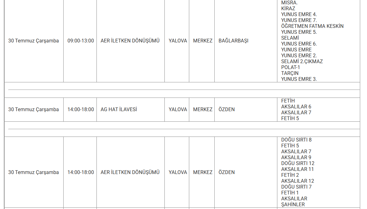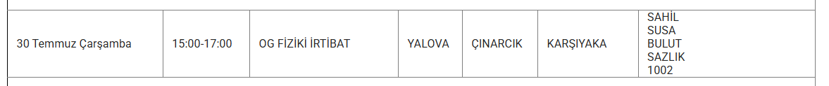 YALOVA YARIN 30 TEMMUZ ELEKTRİK KESİNTİSİ YAŞANACAK İLÇE VE MAHALLELER