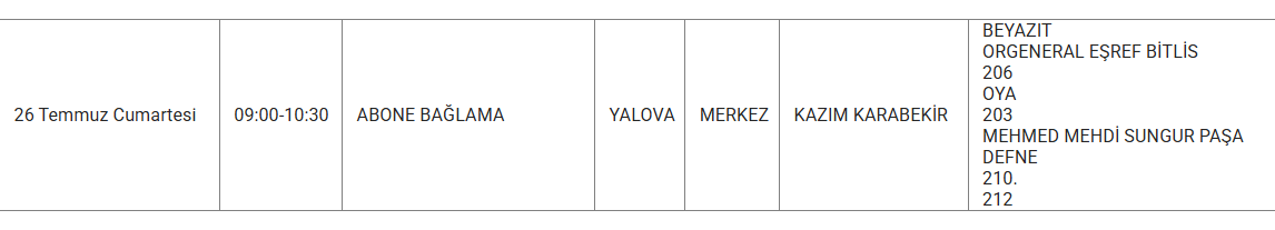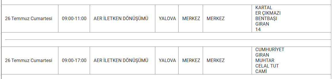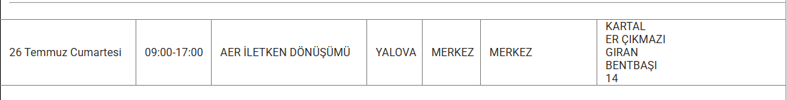 YALOVA YARIN 26 TEMMUZ ELEKTRİK KESİNTİSİ YAŞANACAK İLÇE VE MAHALLELER