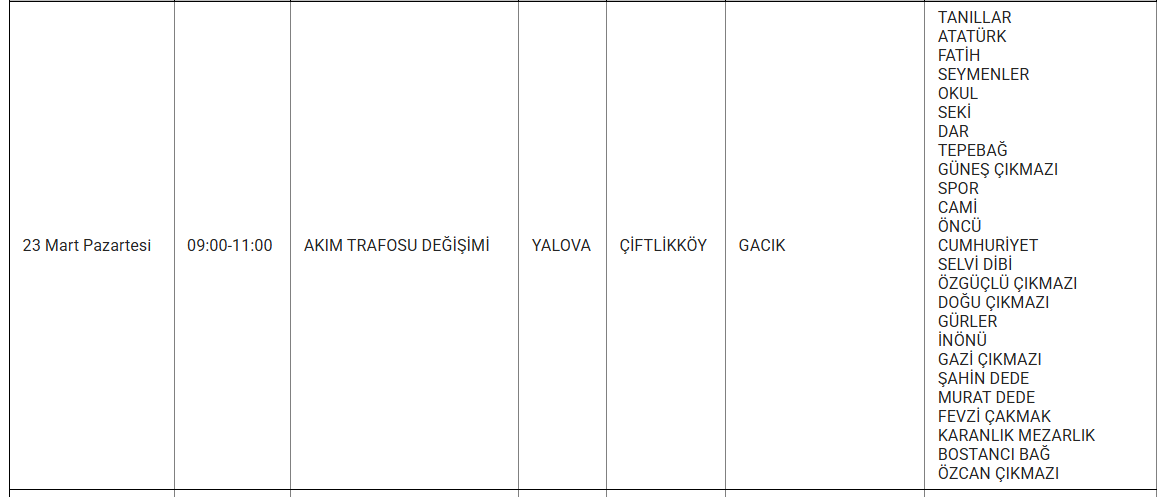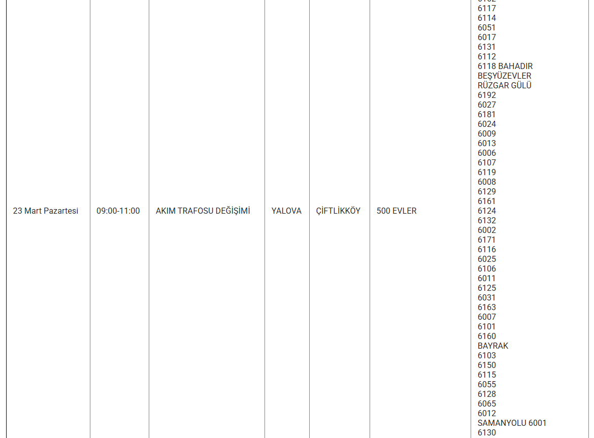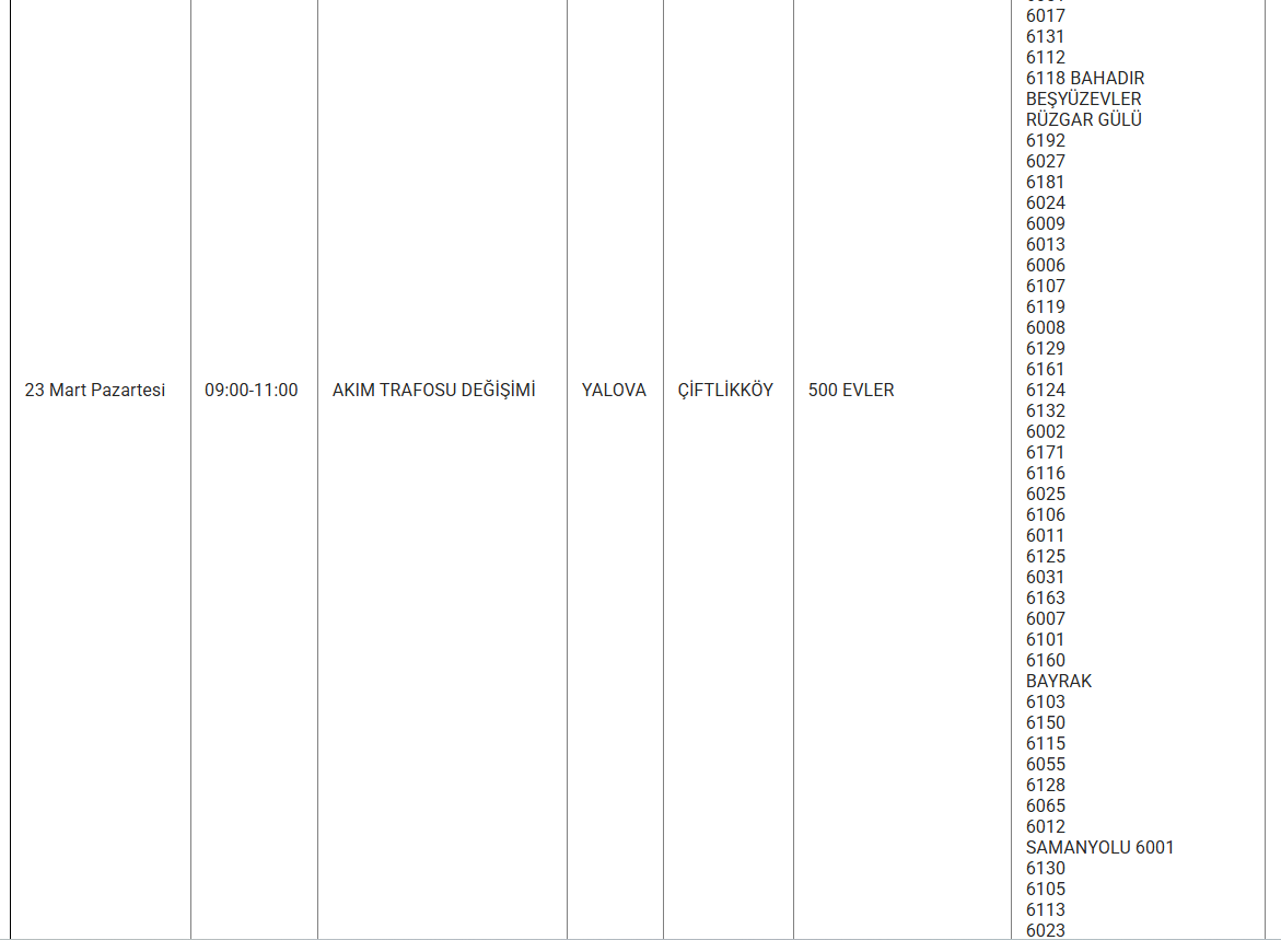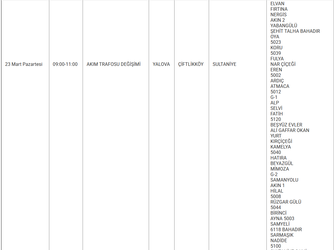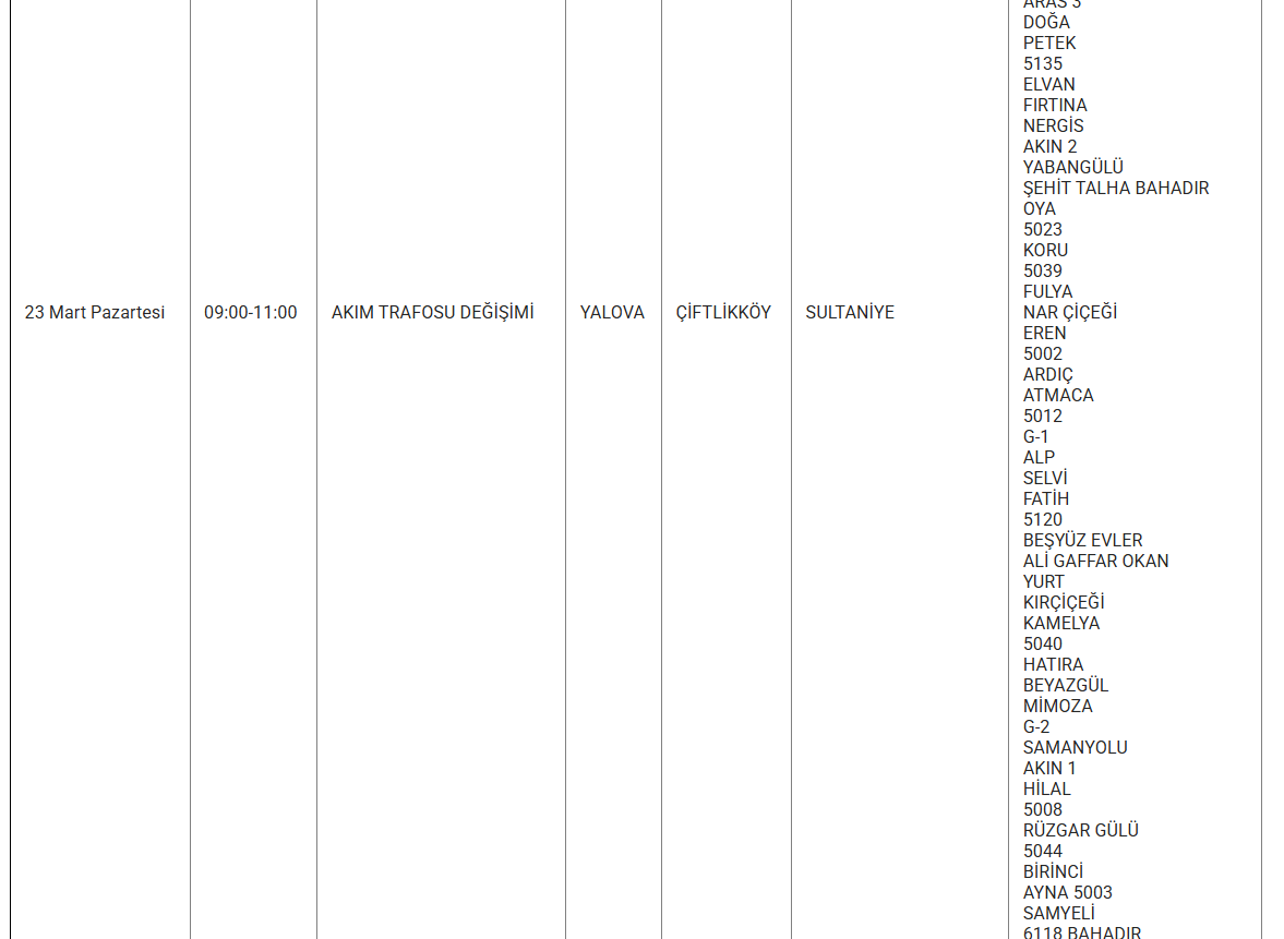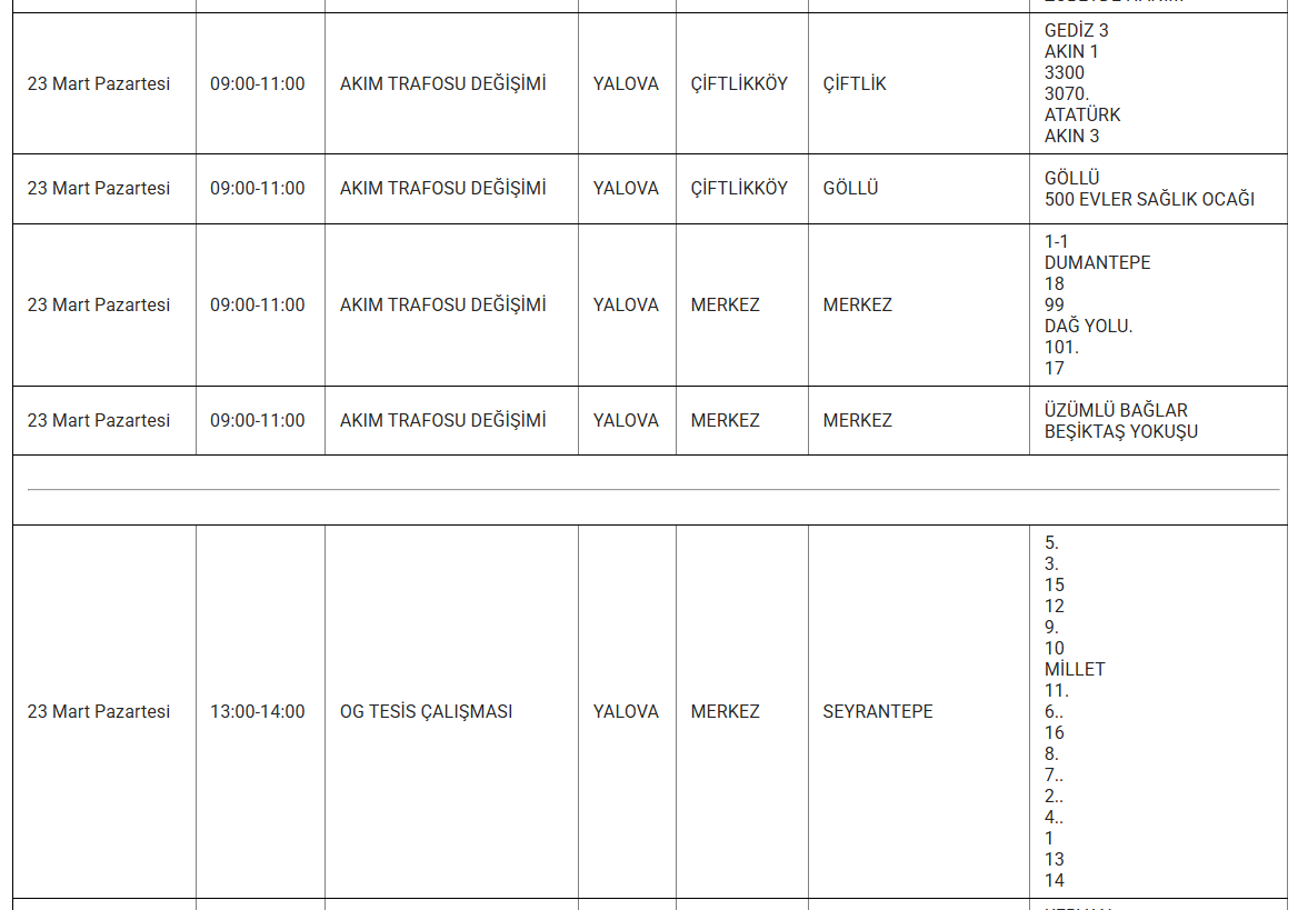 Yalova’da 23 mart 2026 günü birçok ilçe, belde ve köyde planlı elektrik kesintisi uygulanacak. Uludağ Elektrik Dağıtım AŞ tarafından yapılan açıklamaya göre kesintiler, şebeke tesis, bakım ve onarım çalışmaları kapsamında gerçekleştirilecek. Yetkililer, çalışmaların planlanandan erken tamamlanması halinde elektriklerin ilan edilen saatten önce verilebileceğini bildirdi.