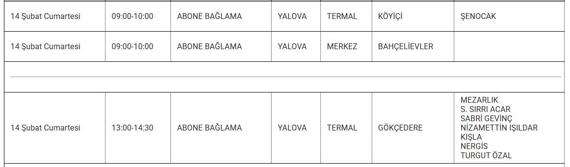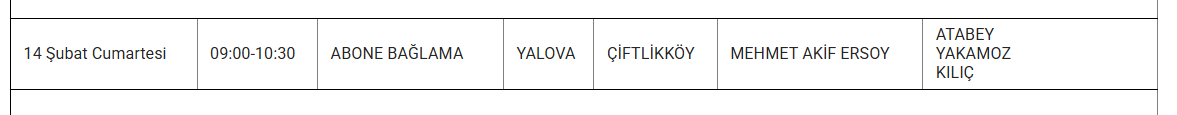 14 Şubat tarihinde Yalova genelinde çeşitli ilçelerde bakım ve iyileştirme çalışmaları nedeniyle elektrik kesintileri yaşanacak. İşte etkilenecek bazı bölgeler ve saat aralıkları: