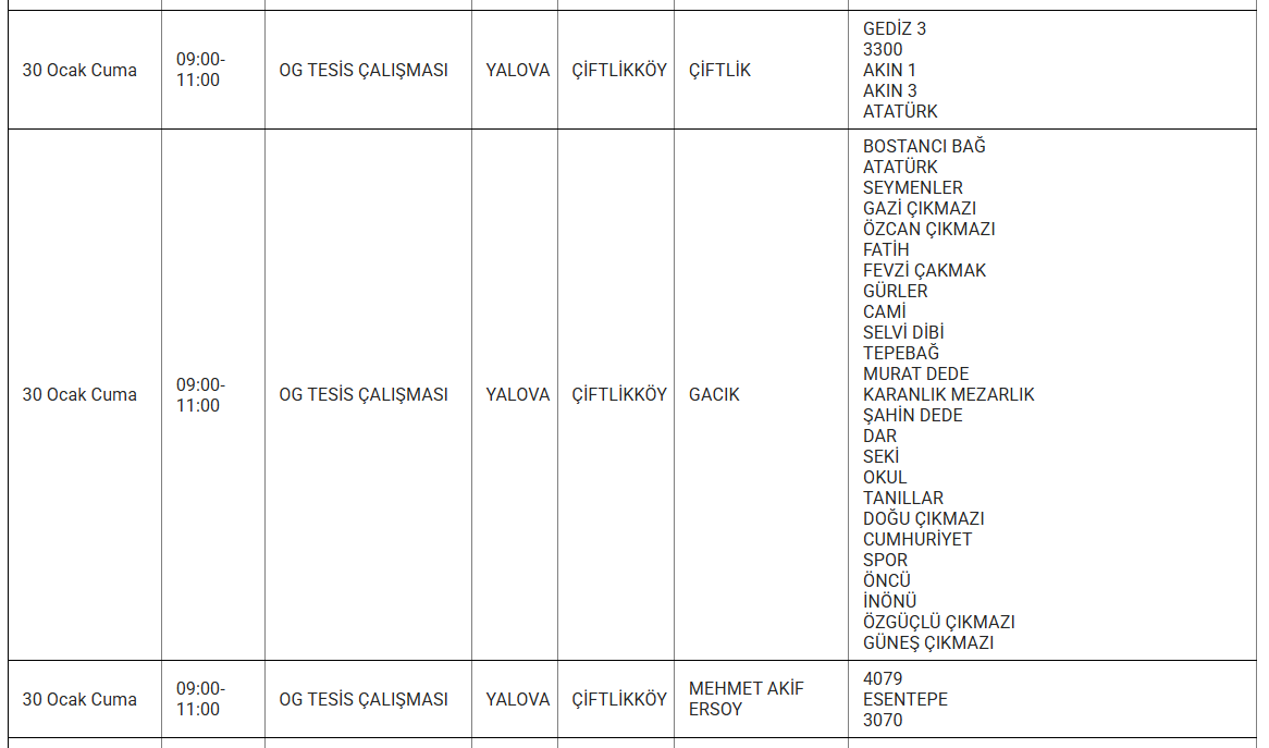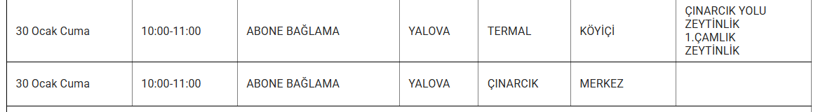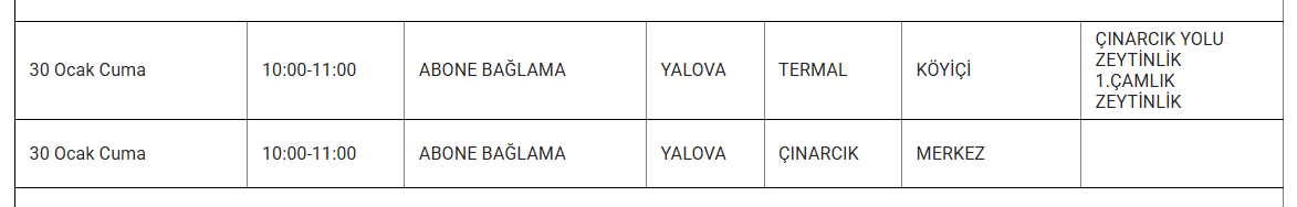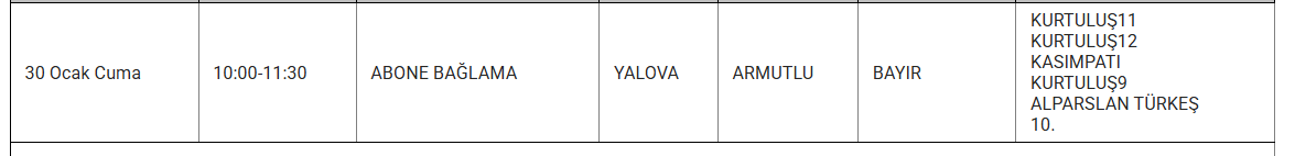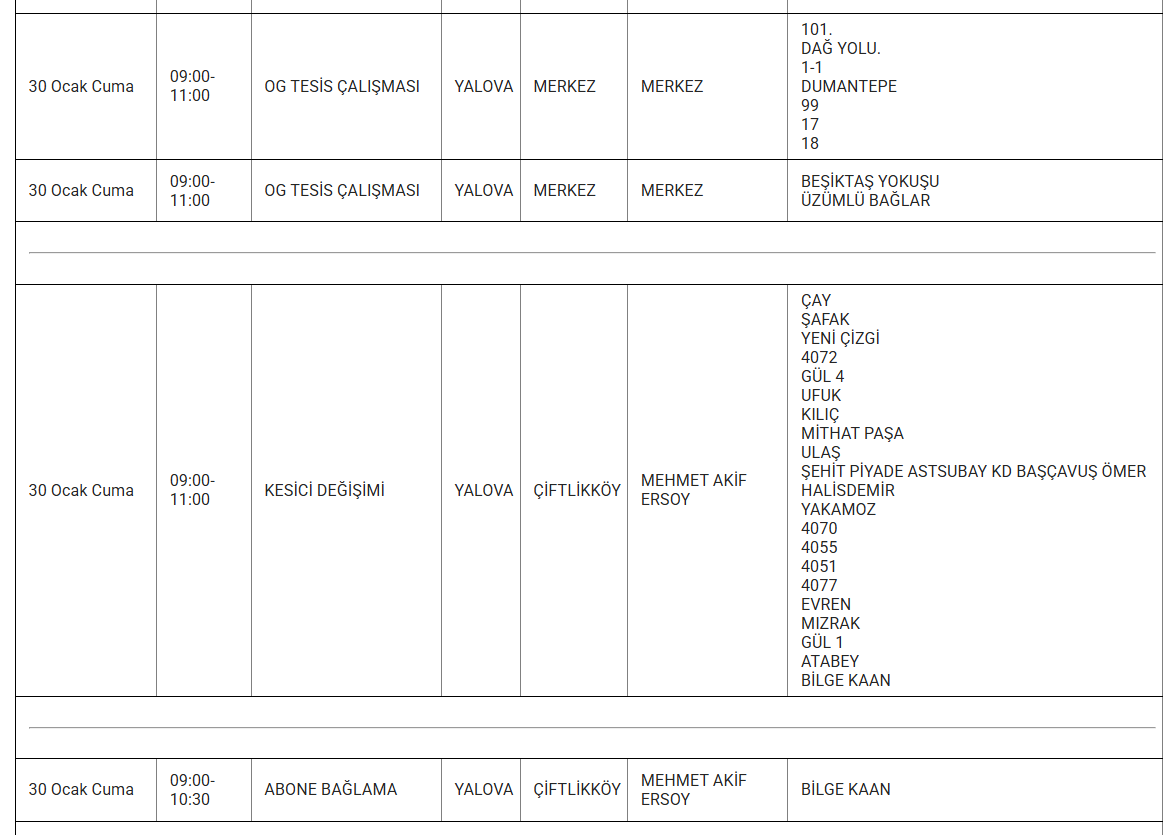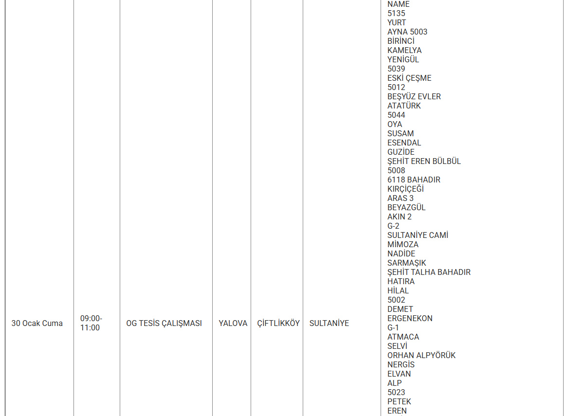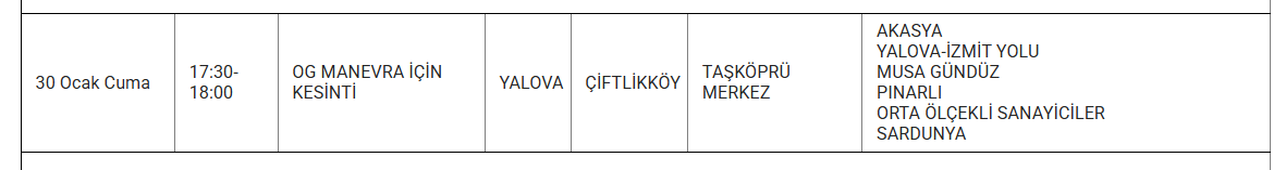 Şirket, kesintilerden etkilenecek bölgeleri mahalle düzeyinde duyurdu. Elektrik kesintisi yaşanacak bölgelerde vatandaşların hazırlıklı olması isteniyor. İşte 30 Ocak günü Yalova genelinde elektrik verilemeyecek ilçe ve mahalleler...