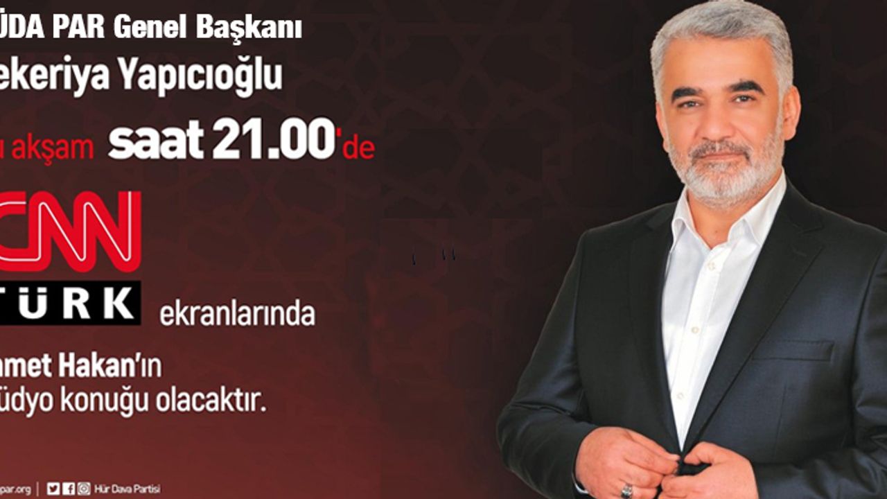 Hür Dava Partisi (HÜDA PAR) Genel Başkanı Zekeriya Yapıcıoğlu ilk önce bugün saat 19.00'da TV NET ekranlarında Faruk Aksoy'un sunduğu Ana Haber Bülteni'nde stüdyo konuğu olacak.