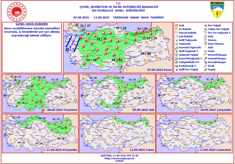 Meteoroloji Genel Müdürlüğü, 8 Eylül 2025 Pazartesi gününe ilişkin hava tahminini yayımladı. Buna göre ülkenin büyük bir bölümü parçalı bulutlu bir hava etkili olurken bazı illerde ise yerel sağanak ve gök gürültülü sağanak yağışlar olacak.